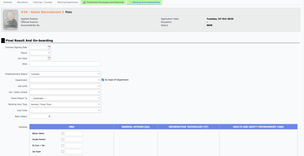 Setelah tahap ini selesai, kandidat resmi berubah menjadi karyawan, kemudian datanya bisa diintegrasikan ke modul HR lainnya (Payroll, Attendance, HR Document, dll).
