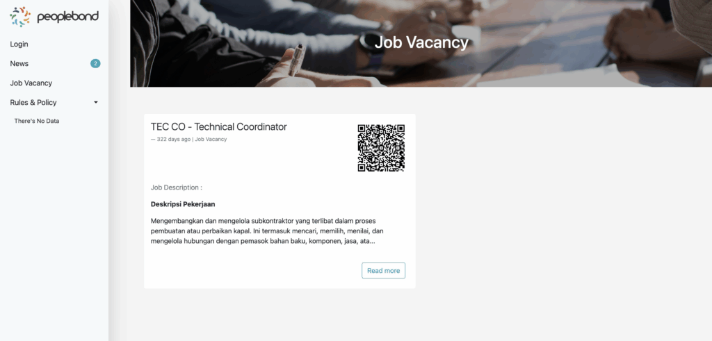 Setelah lowongan kerja live, calon pelamar dapat melihat lowongan kerja di portal PeopleBond > Job Vacancy